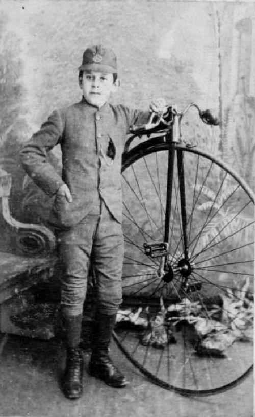 We do not yet have much information on the vehicles like bicycles that English children played with. Images of early bicycles like the penny farthing were mostly rode by adukts. This was not only because they were enpensive, they were also dangerous. The penny farthing bicycle was developed in the 1870s and used in the 1880s. It was rapidly replaced in the 1890s after the saftey bicycle appeared in 1892. While mostlymade for adults, there were some made in small sizes for children. The Coventry Machinists company in England, one of many manufacturers, offered bicycles in their 1880 catalogue bicycles from 38 inches to 58 inches. Bicycle clubs were formed which competed with each other. The Clubs not only helped organized competition, but were sometimes needed for saftey reasons. Reports suggest that coach drivers would sometimes try to run over biycycleists who they thought were slowing them down. Clubs often adopted uniforms. Uniforms commonly included caps, tight fitting jackets and pants, normally knickers. The uniform here was a typical example (figure 1) Tne cap is a bit ifferent. We have Pillbox caps were more common. We have not noted one quite like it. Notice the club badge on the collar. The jackets were cut somwhat like military tunics without laels and buttoned at the collar. Notice the cuaway front at the bottom of the jacket. The uniform almost always included knickers and kneesocks or long stockings. Trouser cuffs could become entangled in the wheel spokes. One observer thought the carte-de-visite portraithere showed a delivery or messenger boy in uniform. We do not believe that penny farthings were used that way. They were too expensive and unstable. What kinsd of item could be delivered on a penny farthing.
