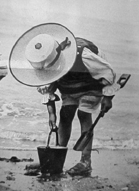 Actually beachwear at the turn of the century did not mean just bathing suits. Children might dress quite formally even for the beach. Boys wore the same suits to the beach that they wore for every day. Linnen or other light-weight sailor suits were of course popular outfits for boys on excursions to the beach in the late 19th century. White suits or other light colors (especially pale blue), were especially popular. Of course they were worn with broad-brimmed sailor hats. Broad brimmed hats were especially important for children as they were for women. I am not precisely sure why children often were dressed in wide-brimmed hats. I am not sure that white complexions were quite so important for children, but still they were commonly dressed in broad-brimmed hats. Other suits such as Norfolk suits with stiff Eton collars were also common, often worn with knee pants or knickers and long wollen stockings. This might not sound like sensible beach wear to the modern reader, but don't forget that Victorian England was far removed from the war weather in sunny Florida. Thus English children might be on beach outings on cloddy days with rather cold water--even in July and August. (Take a good look at how far north England is on the map.) So the heavy suits might have felt quite nice. The stiff Eton collars, however, do seem a bit unreasonable--testifying to the more formal approach to dressing which lasted until World War II in America and even longer in England. The children would take off there long stockings to go wadeing and digging on the beach and shallow water. Older children might build sand castles. Younger children might persue less ambitious projects.