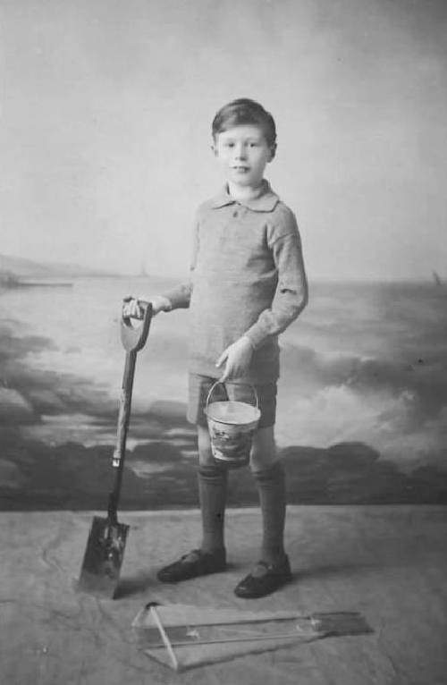 We also see children dressed informally for the beach or at least for seaside beach resort photgraphs. A factor here is that for younger children plsying in the sand is often more important than actually swimming which is a bit beyond them and requires much more careful adult supervision. Even for playing in the sand we often see the children dressed rather formslly in the early 20th century. This changed after World war I when we see children wearing what might reasonably be called play clothes although it will ofte look rather formal to the modern eye (figure 1). Here we see a formal seaside studio portrait from the inter-war era, although we are not quite sure where and when it was taken.