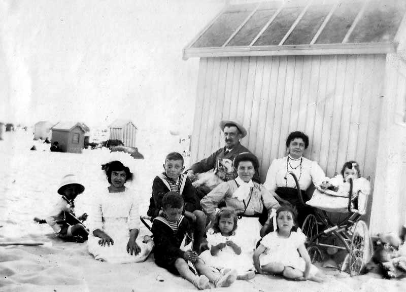 We continue to see children wearing broad-brimmed sailot hats. The hats were sometimes turning up the brims during the 1910s. We notice many other caps, including floppy berets, flat caps, amd miitary-styled caps. Boys usually wore their middy blouses with bloomer-type knickers without shoes and stockings. These were not swim suits, but rather sailor suits wirn to the beach. Girls might also have sailor styled outfits, but we all note white dresses. Children were more klikrly to paddel in the surg and ply in the sand then actually swim. We no longer see girls wearing long stockings in the 1910s. For more serious wading they might roll up their knicker legs. Relatively few boy, however, did this. There seem to be a lot more boys in the available images than girls, I'm not sure why this is.