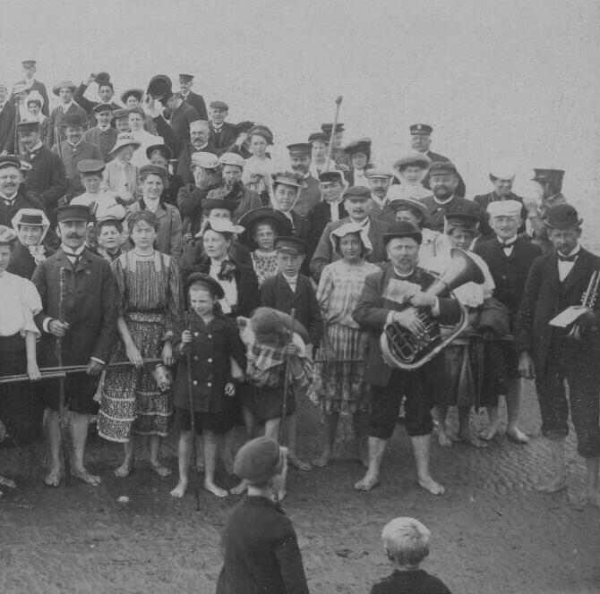 Of course beach wear varied over time. As beach vacations began to become popular, we see beach fashions appearing. Beachwear in the 19th and early 20th century did not always mean swimwear. We see Germans wearing a wide range of styles to the beach. The outfits often seem rather formal, especially beachwear befire World War I. Many outfits were not specifically beachwear, but rather popular syyles that were commonly worn at the beach. The sailor suit was a very popular garment for beachwear during the early 20th century. Boys of course worn many other outfits besides sailor suits. These styles varied over time, but almost all of our seaside beach images come from the 20th century. A German reader tells us about the image here, "The German group is tideland hiking. As the north sea has a lot of that it is rather popular. I did it myself. The man in the front is surly the guide. He guides them through the tideland telling them about animals, plants or what ever can be found in the tidelands. This picture was taken in Büsum in July 1907." After World War I especially by the 1930s increasingly became swimwear. This same trend occurred in other countries as well.