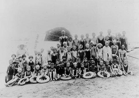 Nor do we know much about beachwear, either swimwear or clothes worn at beach resorts. Swimwear styles appear to have been different than Western styles, but we note some Western stles after World War I and a general shit to Western styles after World War II. We have no real information at this time, but we can begin to piece together some information from a few available images. Beach scenes often show children doing everything but swimming. We are not sure how common that was in Japan. We notice some images of Japanese children in swimming gear. Here we note both Western and traditional style swimwear. How common it was to get dressed up in suits or traditional clothes to play on the beach we are not sure.