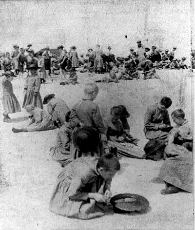 The 273 is the Company card number in aparticular series. Companies like Campbell issued catalogs from which customers could selects card views from various sets such as land marls, peeople, countries, animals, ect. These viewes appeared before it was possible to reproduce photographs in newspapers and magazins. . These sterescope viewers were very common in parlors during the mid- and late-19th and early 20th century. The boys are identically dressed, in matching smocks and wide brimmed, dark smocks. It thus must be a school or more likely an orphage group. The smocks could have only been for playing in the sand or padding at the shore. Th boys could not have swam in the smocks. And in the sun they must have been uncomfortable. Perhaps it was a cool day. It is dated about 1897. We do not think that this was very common in the United States. Smocks themselves were not common. We have never seen boys wearing smocks to school. And orphanage seems more likely, but even here we have not noted them at an American orphanage. We really cannot explain the photograph at this time. It could have been a modesty issue. Or perhaps it was a Catholic orphanage with European nuns.