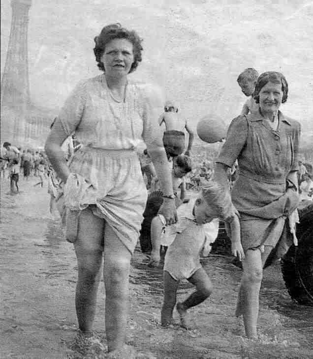 There was of course also the beach. Here is another Blackpool image from the late-1940s and early 50s (figure 1). Mum and Gran are paddling with a young boy. This was about as far as many got into the sea as it could be very cold furtther out. The famous Blackpool Tower can be seen in the background. Also notice the crowd on the beach. A reader tells us, "The illuminations is not a firework show. Its electric light illuminations. Pictures and patterns made up of different coloured bulbs. Each year there is a different theme. Day coach (bus) trippers go to Blackpool in the Autunm and stay until dusk. The coach drives along the route and everyone enjoys the seeing the illuminations. Some years have better displays than others."