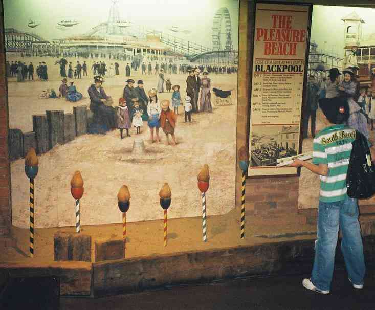 A Wigan Pier Museum attraction is called called 'How we Used to Live'. It is set in 1900. It looks at school. work and holidays. It shows children at the beach in 1900. We see children at a seaside amusement looking at something over a fence. There is also a little girl completing a donkey ride. And a wall display showing Blackpool Beach in 1900. We see a modern day boy looking at the display. We also see children at school and working. A boy is working in the mines. He seems to have the job of opening and closing a door when a truck full of coal comes through. And there is a boy working in a metal workshop. He seems to be polishing a metal boy. He is dressed in knee pants, wears long stockings. Footwear boots. Scarf around his neck and he is wearing a flat cap. The museum describes it as, "An authentic recreation of life in the 1900s for the people of Wigan and surrounding Lancashire. Witness the Victorian way of life – from schooldays through to work and play. You can experience life below ground at the coalface; see how the famous Lancashire pit brow lasses lived and feel the horrors of the Maypole Colliery disaster. In the ever-popular Victorian schoolroom you can also experience the rigours of a strict Victorian education."