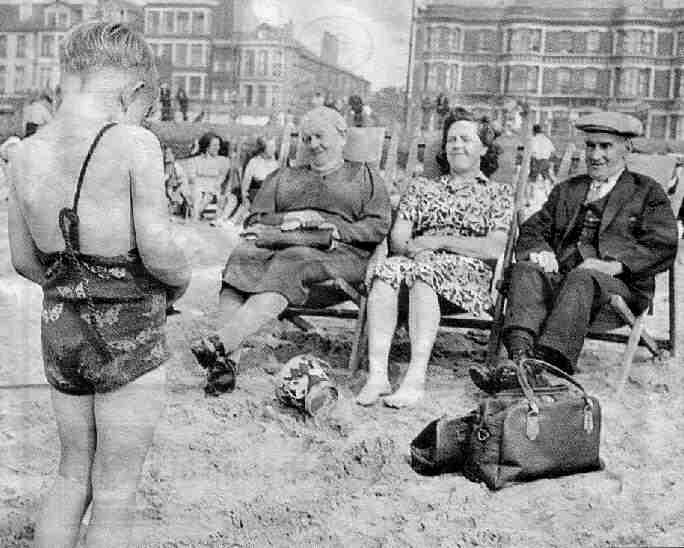Here we see one of the working-class families that made Blackpool so important. A huge number of inexpensiive accomodations were built for them, both hotels and bread and breakfast gues houses. The image here is a good example of how English workibg-class families spent their summer vacations. This photograph was taken in the late-40s after the War or early 50s. The boy appears to be taking a photograph of his Mum and grandparents. You will also see that adults often stayed fully clothed on the beach although Mum has kicked her shoes off! Given the temperature of the water, this is understandable. The 'sea-side' dress habits of the adults shown here is typical of the 1930s and this photo is a post-war hangover from that era. The strap on the boy's 'bathing suit' is to hold it up, but there are two straps. The other one is hanging down his back and is either broken or he has not put his arm through it. Again, this is a typical pre-war style.