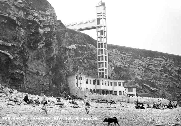 The town has some of the cleanest beaches in the Northeast; one of these is at Marsden Bay. Which is sheltered on one side by steep limestone cliffs. Part of the beach at Marsden is sandy, while the rest is stony and pebbled. An outcrop of rock called Marsden Rock is home to many seabirds, which use both the cliff face and the rock as nesting places. There are many stories regarding Marsden Bay and the Marsden Grotto in particular. The Grotto is a restaurant and bar, which at one time was a notorious place for its smuggling activities and there is a story that the Grotto is haunted by the ghost of Peter Allen who made the original excavations for what was to become a ballroom. The Grotto is unique in that half of it is cavernous as it is located within the limestone rock of the cliffs. There is a lift which takes patrons and other visitors to the bay from the top to the bottom. The more energetic can climb or descend the steps adjacent to the bar.