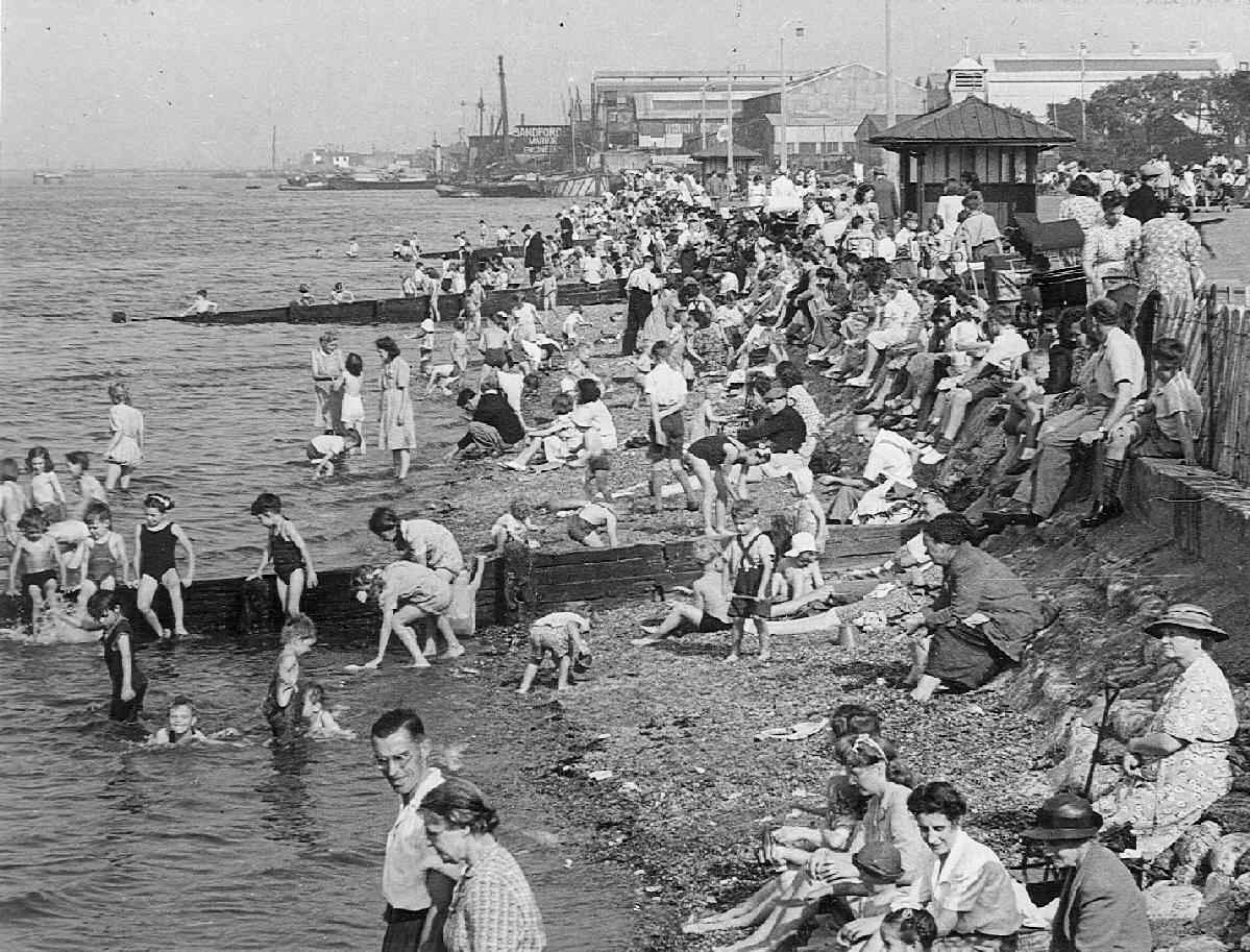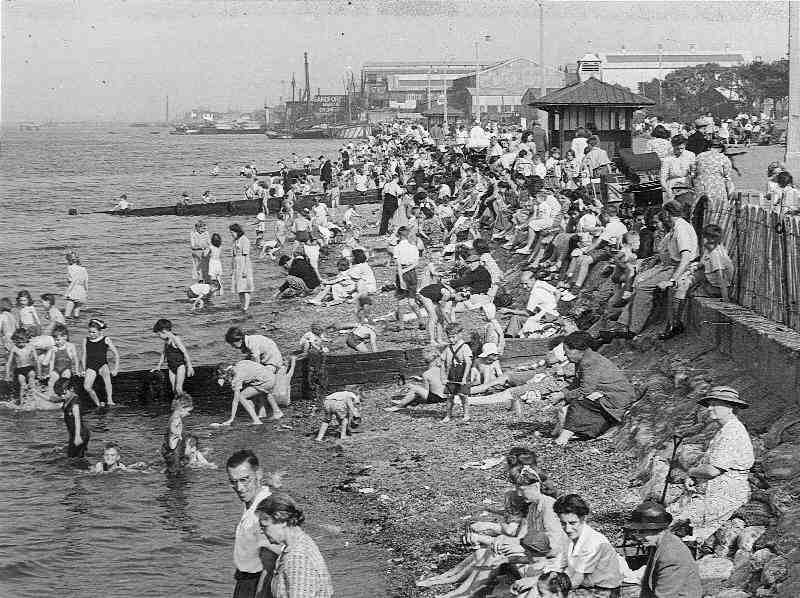 Siouth Banks in some places. As you say the populace looks working class, so they may well be daily trippers from the East End of London. There are no beach huts which would have pointed to an established seaside resort.
