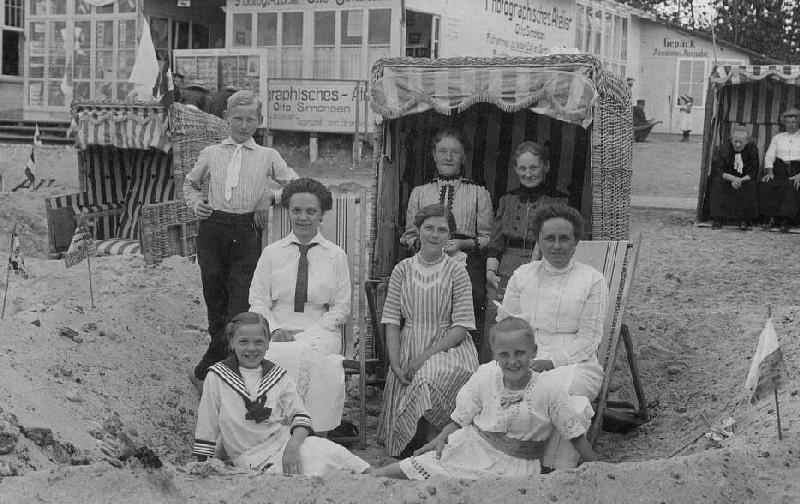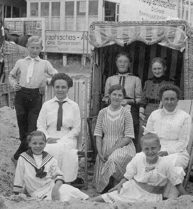 I'm not sure who the people are in the portrait. We assume that the portrait includes brothers and sister or perhaps a cosin aling with mother, geandmother, and aunts. This photograph comes from a Bremen photo album and one of the flags on the picture has the Hamburg crest. So it must be the North Sea. The back you can see a photographic studio. Note that it is right on the beach. The signs advertise the studio/atelier and a place where vacationers can leave luggage. Notice the cabana. This was called a Strandkorb. They were very popular at German beaches. The vacationers would dig a big hole out of the sand and put their cabana in it. The adults could sit and talk there and there was a curtain that could be lower in case anyone wanted to change into a bathing costume. One the wider view (click on figure 1) there are all kinfs of little flags. I am not sure what they are for. Perhaps they were popular tourist purchases. A German reader suggests, "As building sand castles was very popular, this may explain why some were purchased. I have seen several beach photographs with these flags atop of sand castles.".