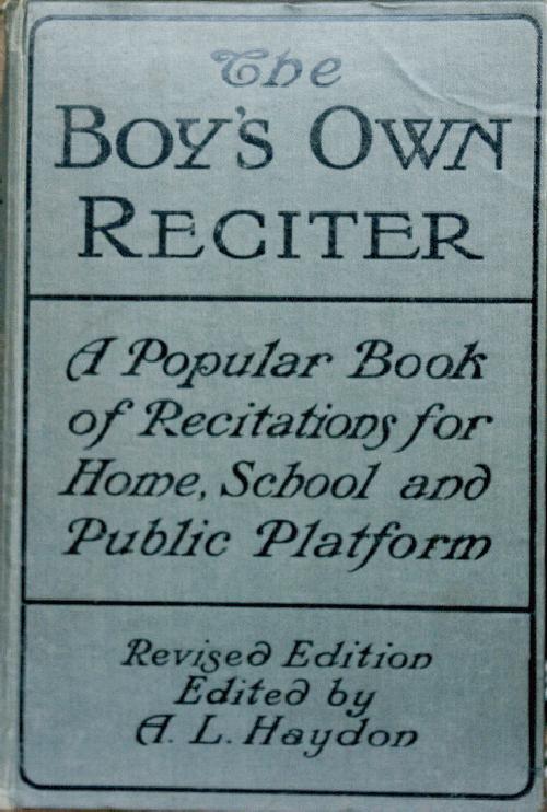 The material matter for these reciataions varied widely. Probably the most common was Bible passages and poetry. Passages from books were also done, some favored authors were Shakespere, Dickens, and Twain. There were even books that parents could provide with collections of material for recitations. A HBC reader has provided a copy of one such book, The Boy's Own Reciter: A Popular Book of Recitations for Home, School and Public Platform edited by A.L. Haydon. I'm not sure when the book was published but imagine somewhere in the 1930s. It looks to be British. It's a charming book packed with poems that allude to boyhood. It has a most fascinating section in the beginning giving instruction on how a boy must give recitations on a public platform, i.e. poetry, debate etc. at school. It has quite a comprehensive content section that's divided into three sections and an index of first lines. There is also an index of authors. Some of the titles are: 'How Tommy tricked the Conjurer' ; 'The Absent Minded Schoolboy' ;