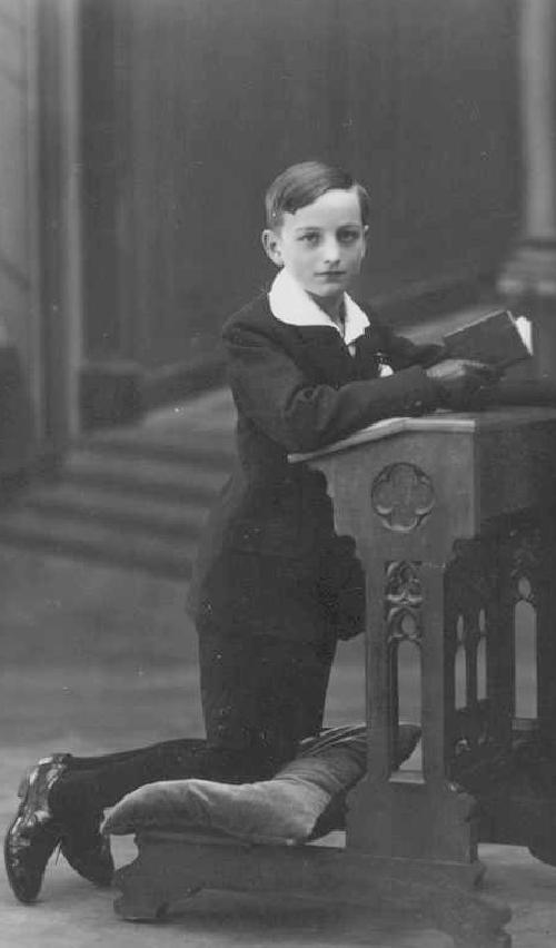 Even when kneesocks became common after World War I in the 1920s, many boys still wore long stockings for First Communion and other formal events. Again almost all the boys wearing long stockings wore dark long stockings. Even solid color black kneesocks were not common, especially in the earlt 1920s. This changed by the 1930s when not only kneesocks became more common, but even patterned kneesocks with loud patterns were sonetimes worn for First Communion. Long stockings become much less common. We also note black kneesocks in the 1930s. Interestingly there were considerable differences among countries concerning kneesocks. Black kneescks were commonly wern in America, but not in England where grey was more common. After World War II (1939-45), most Belgian boys still wore short pants suits for First Communion. Kneesocks were most common.