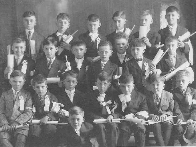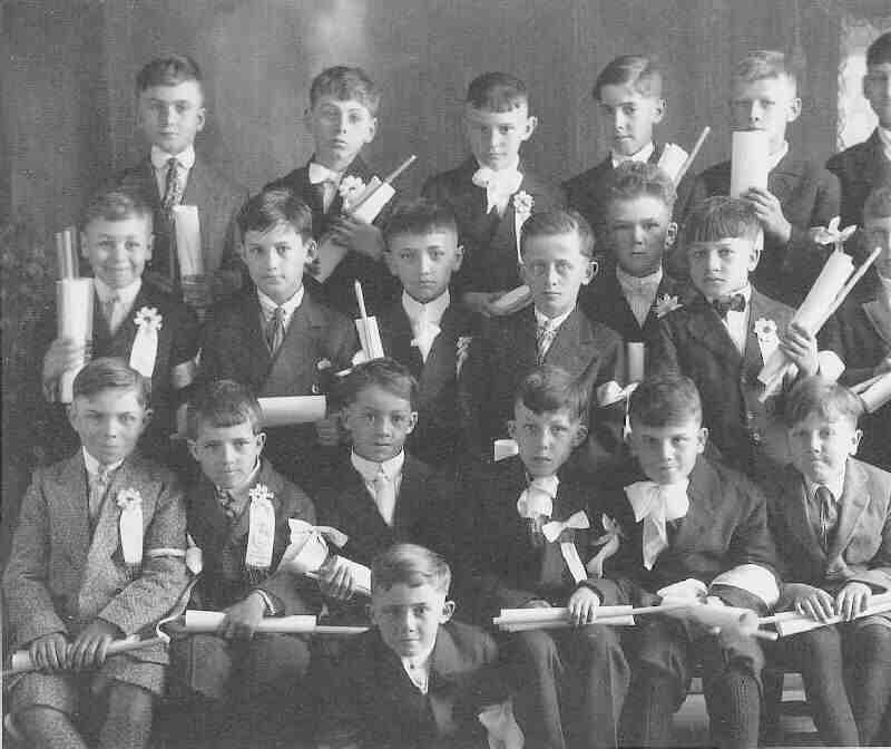 We do not yet have many Canadian First Communion images from the 1920s and are not yet sure of trends during the decade. We see boys wearing dark suits purchased specifically for First Communion. We note these conservative dark suits earlier in the 1900s and 1910. They were worn with long black stockings. We also see regular suits. Boys from less affluent families might have their father's old suit cut dwn for the occassion, but many mothers were willing to splurge and buy a new suit if at all possible. Most of the boys wore knickers or short pants suits.