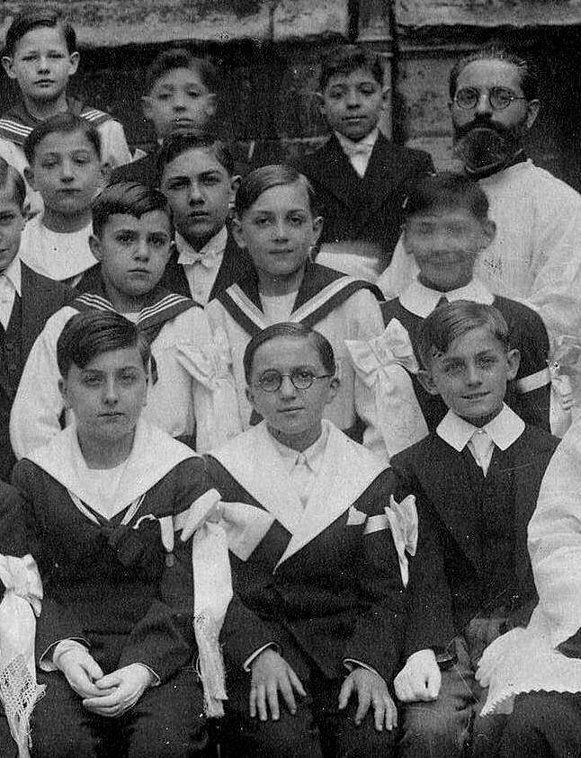 Some schools and churches selected religious-looking vestments for the boys. We don't see the girls wearing these oufits. We think this was because these were garments worn by priests and friars/monks and not by nuns who wore destinctive habits. They always wore white junior wedding dresses. We see boys wearing sepluses in the 1920s. As best we can tell this was rather rate, but we have only begun to address this topic. After World war II we see some boys wearing white cassocks. Some were worn earlier, but most examples we have found come after the War. This was not the most common choice, but we see quite a number of examples. When we see boys wearing these relgious garments, it seems to be always a kind of group outfit. The other outfits were often individuall selected. We see groups wearing mixed outfits. This was nor the case when the religious outfits were worn. In these cekebrations the boys were all dressed alike.