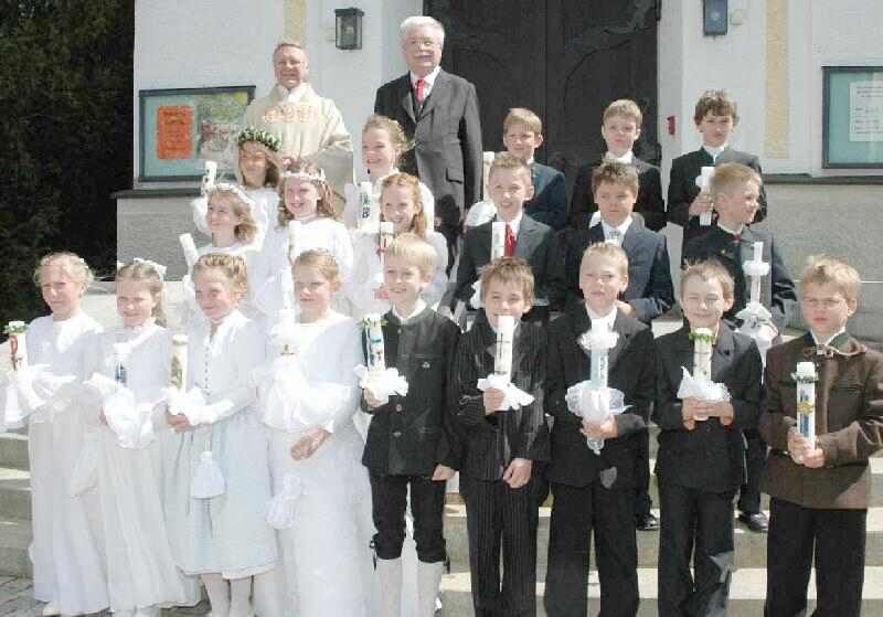 We do not yet have much information on German First Communions during the 2000s. One portrait in front of a small church in southern Germany during 2002 shows the children all dressed traditiionslly. The girls all wear junior white wedding dresses and most have little white pouches. I'm not sure what was put on those pouches. The boys mostly wear standard black suits. Several wear Bavarian-style jackets rather than a standard suit jacket with lapels. The Bavarian jackets vary somewhat. One is brown. One of the boys wearing Bavarian jackers weares knicker-length pants and white kneesocks. All of the children have candels. Many of the boys do not wear neckties. Two boys wear red neckties. This probably reflects an overall decline in the popularity of neckties. We are not yet sure how common this was.