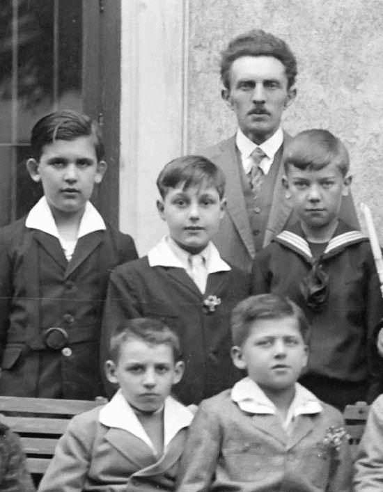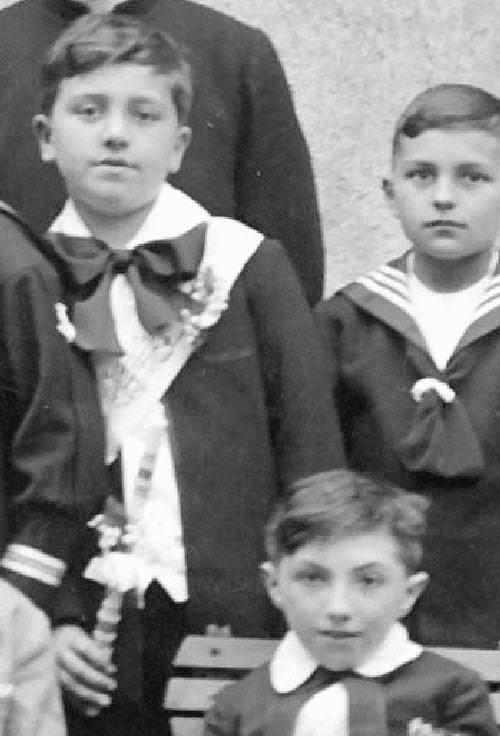 In sharp contrast to the boys with these formal collars are several boys with open collars. This was not common before World War I (1914-18), but reflects the trend toward more casual clothing after the War. Here it iseven seen for a First Communion service--normally a rather formal event. To make it look more formal, some boys wear their open collars with dickies. Open collars became even more popular after the War. The open collar appears to have been so stylish that one boy wore an open collar folded over his jacket lapels and another shirt and necktie underneath. Equally puzzling is the boy with two open collars.