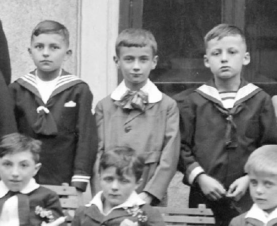 The sailor suits all vary. The dark suits perdominated. All the boys in sailor suits are in the back row for some reason. The boy on the right has a pocket handkerchief, a plain white dickie and a white ribbon to keep the front tied. His sailor blouse appears to have three white stripes two blue on the collar and two white stripes one blue on the cuff. The boy on his left wears a sailor suit with a navy dickie with two white stripes and one blue stripe on the collar, cuffs and dickie. He also appears to have a white ribbon to keep the front tied and maybe an insignia on his blouse sleeve. The boy on his left wears a navy sailor suit with three white stripes and two blue stripes on his sailor collar. His dickie is plain navy. He does not appear to have any ribbon on his front ties. The boy in the back row on the very left wears a white sailor suit with a navy collar and three white stripes and two navy stripes on the collar. His dickie is plain white and the front ties are tied with a white ribbon. He may be wearing a flower pinned to his blouse. The boy to his right is wearing a vested dark colored suit. The white shirt is worn with an open collar, the vest has a lapel and the jacket is single breasted. Is he wearing a watch fob? The boys in the front row from left to right. The boy is wearing a collared shirt with a tie and a double breasted dark collared short suit. His white knee socks have a striping just below the top. His shoes look modern with a design on the front. We do not know what kind of caps were worn with these suits.
