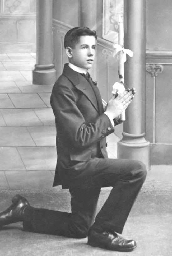 This boy is quite destinctively dressed for his First Communion. He has hair that is not cropped nearly as closely as the other boys. He is also the only one in the group wearing a very adult-looking long pants suit. It is an elegant looking suit double-breasted suit with wide lapels that were quite stylish at the time. He is probably wearing his new suit for the first time for his First Communuion. The suit is not as dark as the ones worn by the other boys. He has the same white wing collar that many of the other boys wear. His shoes look more modern, but are still high tops. He is posed in a poor pious way than the others boys, knealing down.