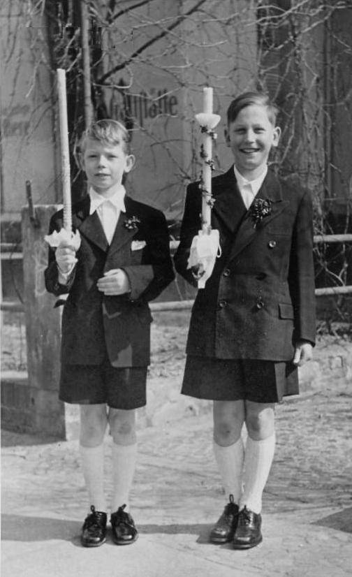 German boys until well after World war II mostly wore knee pants or short pants First Communion suits. We also see knickers, but they were not very common, probanly because it was mostly teenagers who wore jnickers, above the First Communion age. We do not see many boys wearing long psnts sduits for First Communion until well after Workd war II. Long pants suits begame more common during the 1970s. .