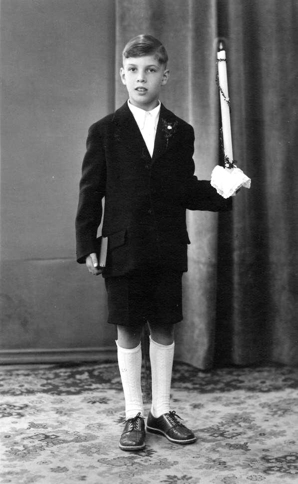 Boys wore suits with both single breasted and double beasted styling. Norfolk styling appeared in the late-19th century. We do not see many First Communion porteaits, however, until the early-20th century. Thus we see some Norfolk suits worn for First Communion in the early-20th century. We mostly see boys wearing either single- and double-breasted suits. We think thast the double-breasted suits were considerd a little more formal which is probably why we see quite a number of double-breasted suiots for First Communion. The single-breasted suits became increasingly common in the 1930s. We do not see the sleeve sashes like we often see in American and France. We do see some boys with lapel boutonnieres. We do not see many German boys wearing Eton suits as was common in America.