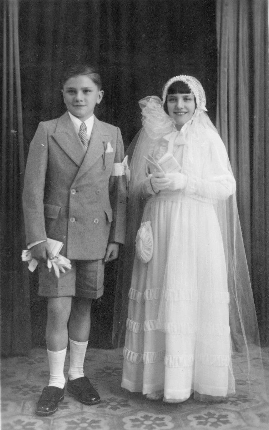 This Genoa brother and sister are having the First Communion in 1934. The names look like Amalia and Luisitto Cella (figure 1). It is a studio portait the children are sending to their aunt Giulia.
