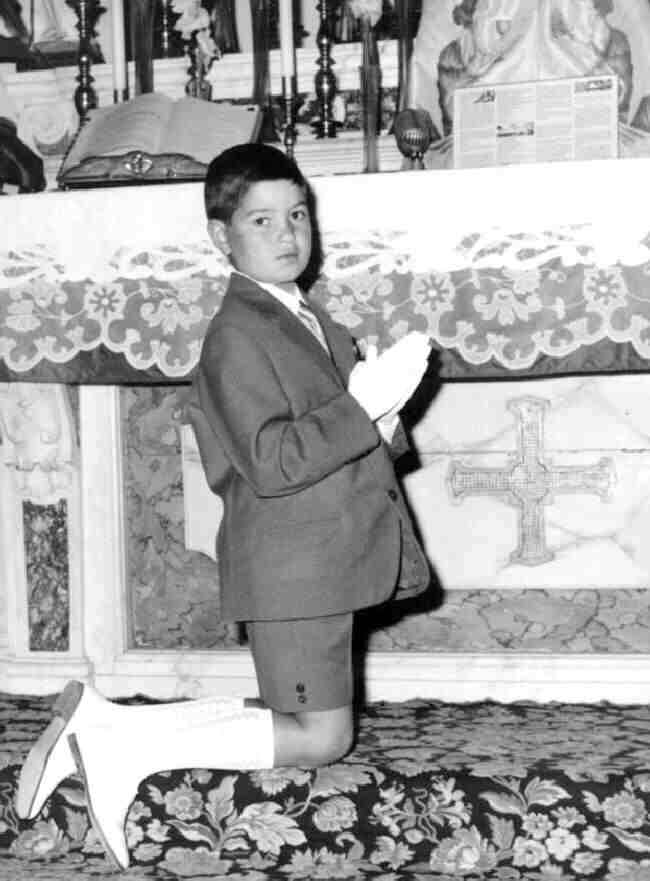 The boy here is part of a group in the early 1950s. We are not sure just what kind of group it was. There were nine children. That seems to be too small to be a school group. The children are emaculately dressed. The boys wear what look like expensive short pants suits. The boys all wear exactly the same suit which means a suit had to be purchased specifically for the ceremony. The only difference we note is slightly different white kneesocks and one boy wearing black rather than white shoes. The girls wear what look like little nuns habits. (Minature wedding dresses were more common.) These outfits look expensisve thus this could not have been a normal primary school group with children of varying economic backgrounds. Perhaps they attended an exclusive private school. The children were photographed at the altar with the priest that gave them their First Communion.