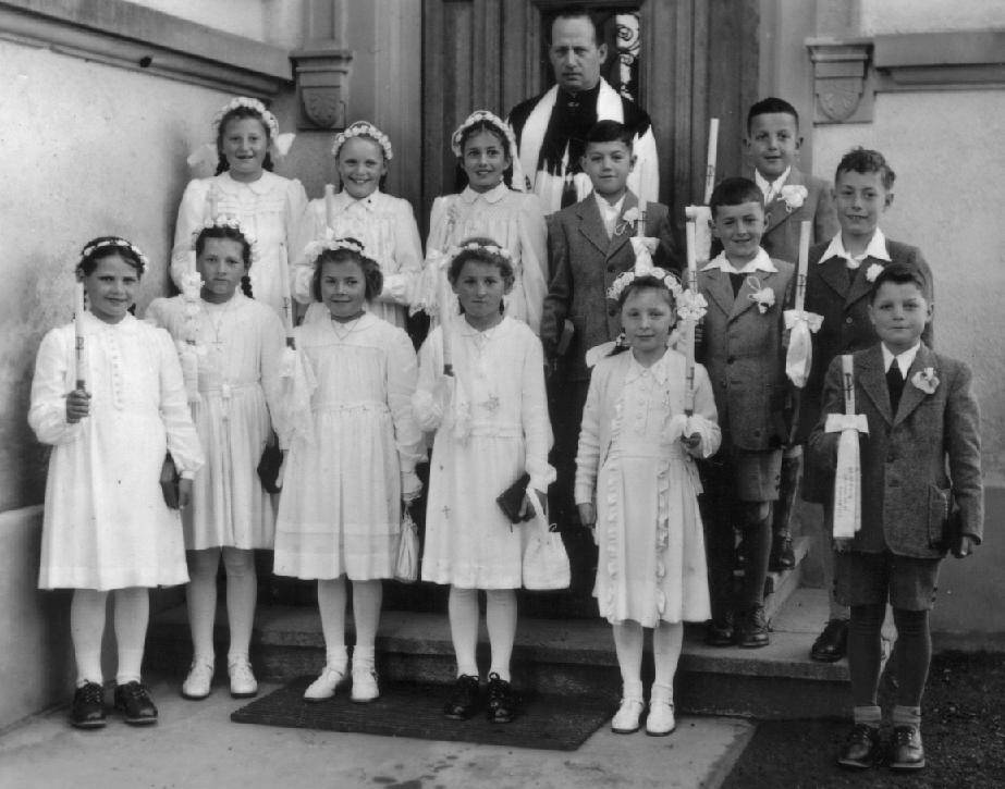 We have just begun to assess the chronology of Swiss First Communions. Our archive is still very limited. We do not yet have information on Swiss First Communion in the 19th century or even the early-20th century. We note boys at mid-century wearing medium-colored short phnts suits with either knee socks or long stockings. Dark suits with white knee socks as we see in Germany seem less common, although some boys did wear black long stockings. he girls wear white junior wedduing dresses and white long stockings. Catholic boys through the 1950s wore their best Sunday suit for the special First Communion event. Cassock began to become popular for First Communion in the 1960s. The custom of wearing a cassock started in French speaking Romandie and quickly spreading over entire country, becoming the most common First Communion garment. Presumably it originated from the cassock worn in religious services by boys choirs such as Les Petits Chanteurs à la Croix de Bois. Today the cassock is worn by both French and German speaking Catholic boys for First Communion.