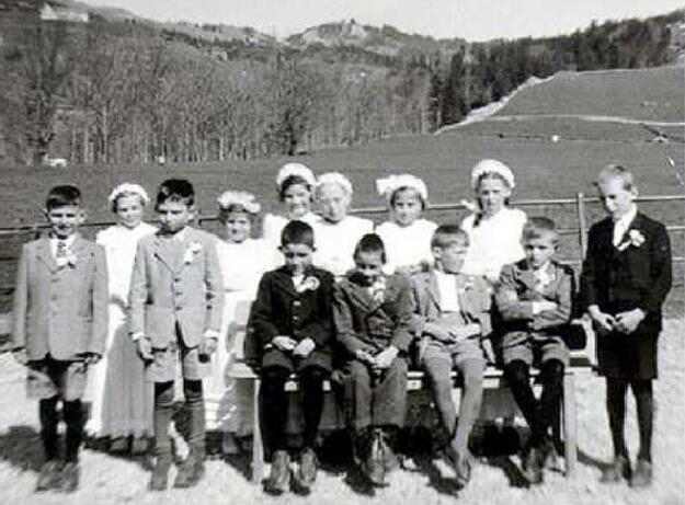 We note Swiss boys wearing a range of outdits for their First Communions. The most styles for Swiss First Communion outfits included suits, sailor suits, and cassocks. Sailor suits were one of the popular styles for sailor suits. Since the 1960s, however, cassocks have become more important. Boys also wore their best suits for First Communion. In many cases a new suit was bought for the occasion. Often parents brought a brand new suit for the occasion. The suits were normal dress up suits. They were mostly rather dark colors, either grey, blue, brown, even black. There were no white suits. Cassocks are now the most common costume for First Communion in Switzerland. Note here the similarity between cassock and school smock, all boys being dressed with a uniformity rule in front of Jesus or teacher, social differences being erased. A Catholic Swiss contributor reports that First Communion is a large celebration where all is festively dressed.