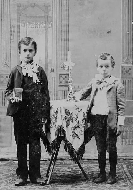 For the first time we see a substantial number of boys dressing up in new suits for First Communion for the first time. Buying a new suit was no small matter for a working-class family. We suspect that most could not have afforded similar celebrations it in Europe. In America, an increasing number of catholics could. We have not found nearly as many First Communion portraits as we see after the turn-of-the 20th century, but we begin to see examples during the 1890s. We think the primary difference between the 1890s and 1900s was the growing income and success of immigrants. White suits were still not common in the late-19th Century. Nor were white stockings commonly worn. We do see boys wearing fancy Funtleroy outfits in the 90s. This is important because it looks like Catholic families were npt purchasing outfdits specifically for First Communion. A white suit would have had only limited use after First Communion. What parents did was the practical step of buying a new standard suit that the boy could have worn for best after the his First Communion celebration. We are not sure about the junior wedding dresses that girls began wearing.