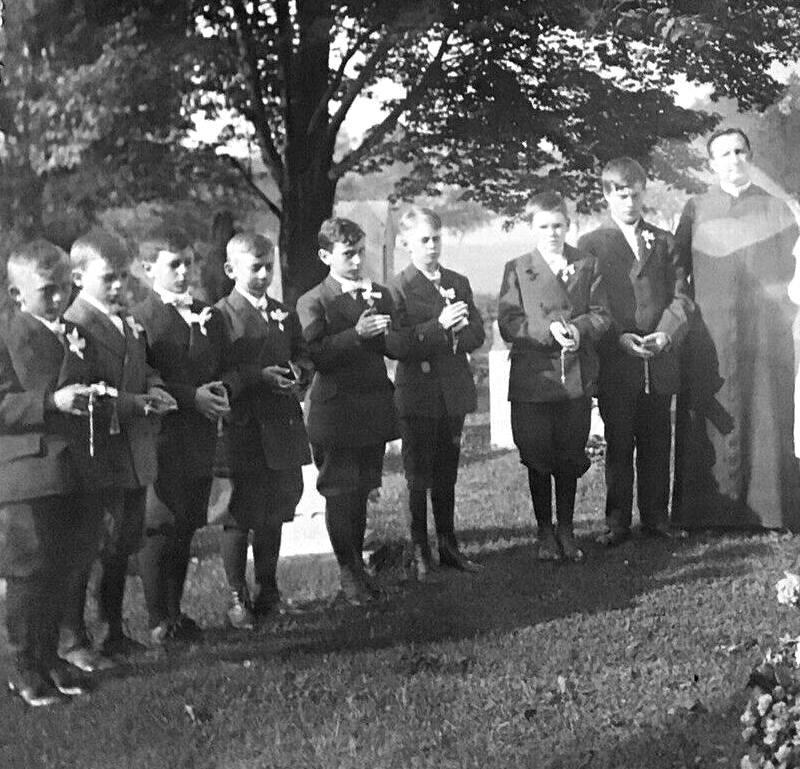We believe that white outfits for First Communion first appeared in significant numbers at the beginning of the 20th Century. We do mot see them earlier. The all-white blouse and knee pants outfit here may have been taken about 1905. Note the whute long stockings. We also see boys wearing white blouses with regular usully knickers and long stiockings. We have not yet found white suits in the early-20th century 1900s and 10s decades, but that does not mean that they did not exist. It does mean that they were not very common. What we mostly see, especially if a group is involved, is dark probably navy blue knicker suits. They were worn with we think black long stockings. There may have been some navy long stockings, but we believe thst blsck was much more common. It is virtually impossible to destinguish between black and navy blue in period photography. That was if not the trandard fitst communion suit, certainly the most common. We also see some boys wearing a range of lighter colored suits not puurchased especially for first communion. This was never the choice in group ceremonies. White gloves were common fashion accesories. We do not begin to see boys and girls wearing knee socks for formal events until well into the 1920s. For the girls there was no color variety. Their outfits included headwear which might include veils and flowers. The girls all wore white junior wedding dresses. The styles and cuts differed, but never the color. They were all white to reflect purity like wedding dresses. In thus period the girls also wore whuite long stockings and white shoes, although we also see dark long stockings and black shoes.