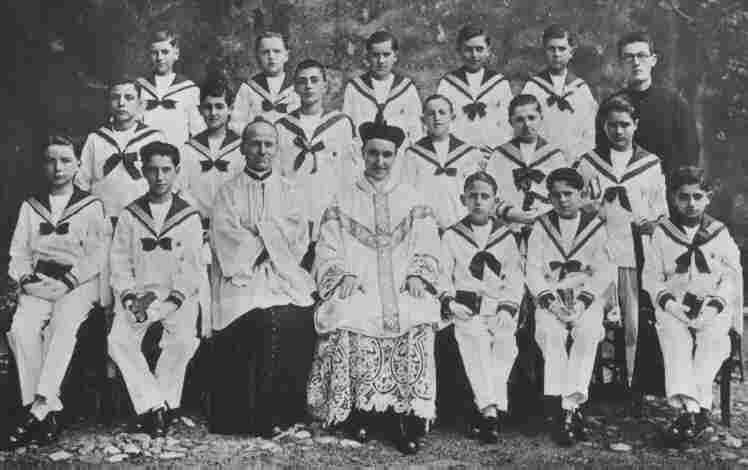 Some churches also make a major event out of the child' renewing his vows. HBC has less information on this event than First Communnion. There are confirmation ceremonies in both Catholic and Protestant churches. Generally speaking confirmation is more important in Protestant than Catholic churches. France is of course a primarily Catholic country. A French contributor has provided information about a Catholic boarding school during the mid-1930s had the boys (les renouvelants) dress in emaculate white sailor suits to renew their vows. The sailor suits were probably also worn for First Communion. The sailor suits are trimed in blue, but insread of three white stripes as is traditional in England (for Nelson's three great victories over the French), have red stripes. This presumably mirrors the uniform worn by the French Navy during the 1930s. They all wear black oxfords rather than white shoes--presumably an economy measure. I do not know how common this was, but have some reports from Spain that boys also wear white sailor suits for First Communion. We are unsure as to how common sailor suits were for confirmation in other countries.