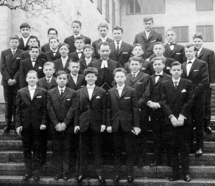 German boys in the 1960s generally dressed up in dark suits for their confirmations. Often a new suit was purchased for the occassion. A German reader Dieter who had his confirmation in 1968 writes "This is the photo of the whole confirmation group. You see. This is the picture of all the boys. I`m the boy in the first row at the right side (figure 1). The photo was made in 1968 after my confirmation in Münster, located in the western part of Germany. At this time I lived there with my parents, two sisters and one brother. It was a rural area and we`re a religious family, like all the other people were too. At this time confirmation was a important date in a boys life. We celebrate a big party with all my relatives, but more contemplative than today. I remember that I got only a few presents from my Patentante and Patenonkel (godfathers). A bible and two other books. My parents gave me as a present a white collared shirt and a tie; I believe