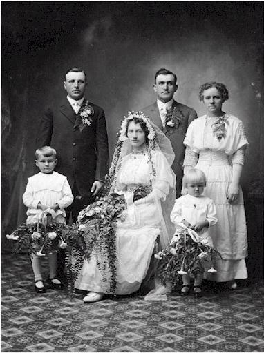 Here we see an unidentified wedding in America. We would guess the portrait was taken in the 1910s. The earlt-20s is possible, but the 1910s seems the most likely. Here there are two children involved. They are both dressed in white. The older child is clearly a boy. He seems to be wearing a fancy blouse, but we can not see the rest of the outfit. The other child is probably a boy, but we can not be sure. He seems to be wearing a tunic suit. Both child wear white long stockings and black strap shoes. They look to be about 3-5 years old. They are holding flowes in the portrait. The older boy was probably the ring bearer in the wedding servive. The rest of the wedding party is not dressed so informally.