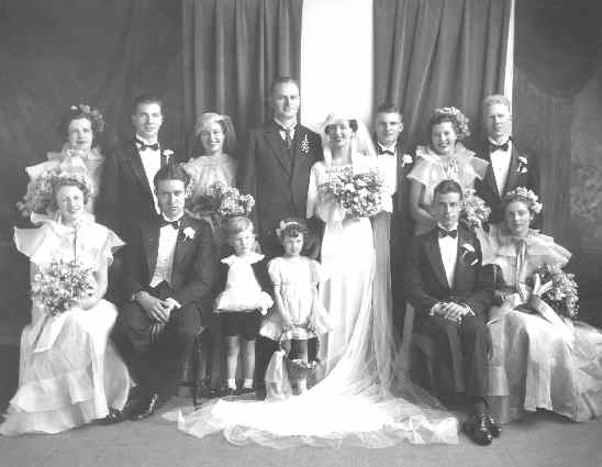 This formal wedding was held in 1921 or 1922. There are four children in the wedding party. One girl carries the train of the bride's dress. Two nore are flower girls. There is also a boy about 5 who serves as the ring bearer with a large white ring pillow. All the childreb and women are dressed in white outfits.
