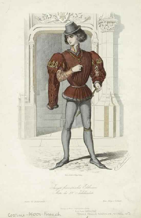 HBC doesn't have many images of teen-age dress from the late medieval period. Some available images illustrate the various garments worn by pages during the medieval era. The styles of courtly male dress during this period were strongly influenced by Italy, the country that led Europe in the extravagance of male clothing. Northern Italy is where the Renaissance began. The spread of ideas and social attitudes spread north just as did Italian fashions. The two most important items of clothing were doublets and hosiery. We also note destinctive headwear and footwear. There were no dedicated styles per se for children in the late-medieval era. Younger boys wore dresses like their sisters. Once brreched, however, boys abd youths wore the same style clothing as men. Youthful style concsious youths and young men might wear shorter doublets than oldermen. Men in their middle-age might wear long cloakes.