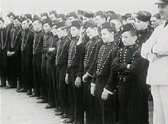 Pageboys need to be mentioned under the catergory of workers. The term apparently derives from the mideieval pages who attended persons of rank. I'm not sure when hotels began uniforming boys and calling them pages to perform tasks at the request of guests. I think probably the 19th century. Working class boys in England would enroll at age 14 (school leaving age in Britain pre-1944) to work in hotels, theaters, or clubs as well as on ships. Boys also worked as pages/message boys for private companies. HBC has only limited information. A HBC reader reports," I recall doing some messagering work in the early 1970s and having to collect some airline tickets in Bond Street. Waiting at the counter was a boy of about 16 years in pageboy rig, probably from a posh hotel." They often wore very destinctive uniforms. The classic design of uniform, was based on late-Victorian British military uniform. The most notable feature of the classic pageboy uniform was the pillbox cap (figure 1). The cap was often worn at a rakish angle and held on with a chip strap. The rest of the uniform varries, but commonly had military styling. This outfit was adopted all over the world, especially in the United States and is still seen today in especially posh hotels. I believe it was a standard throughout Europe. Americans of an earlier generation will recall a hotel page in early 1950s TV who was calling Philip Morris, a brand of cigarettes. The same military uniform, or at least the pillbox cap, was also adopted by the Boy's Brigade for their uniform and like hotel pages worn for decades after it was discarded by the army. Hotel pages, unlike the Boys' Brigade members, always wore long pants uniforms.