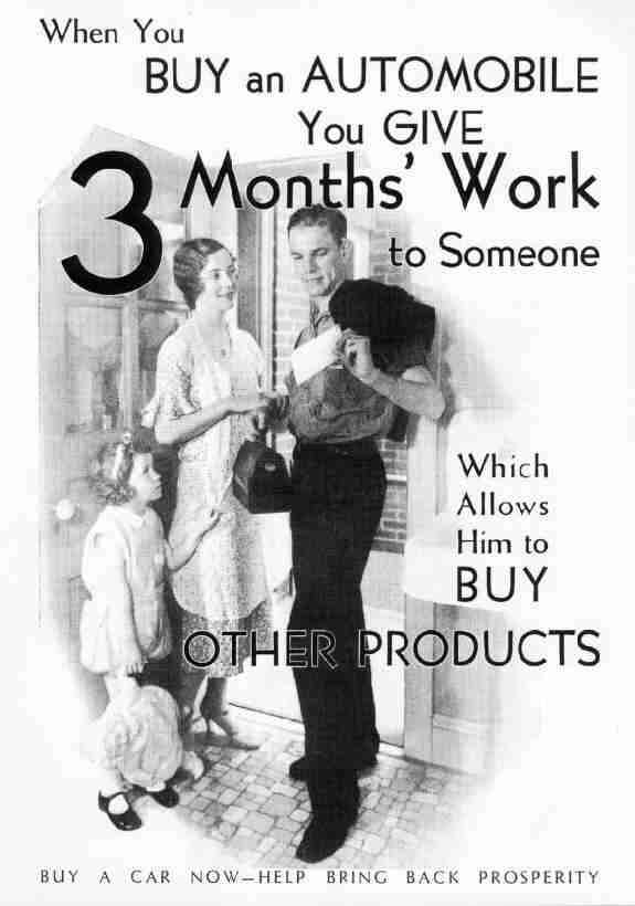 Here we note a Depression era poster, urging Americans to buy cars so that workers had jobs. The poster is undated. We suspect that it was made in the early 1930s. Both the clothing styles and the message suggest this.