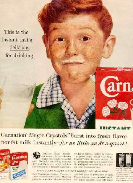 Carnation, better known for canned milk, was promoting instant milk crystals in the 1950s. A boy is pictured enjoying a glass