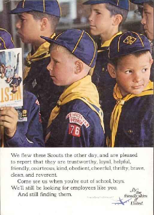 We note a lot of ads featuring Scouting in the 1960s. The buying power of children and youth was increasing. This would be the last decade that we will see Scouting so prominently featured, in part because Scouting began to decline in popularity after the 60s. By the 70s we begin to see many more recreationl options for children as well as a range of other changes. The focus on children did not decline, only the use of Scouting. United Airlines had a magazine ad in 1968 featuring a pack of Cub Scouts taking a flight. They are all perfectly uniformed and of course well behved. I neve recall tking an airline flight as a Cub, but thr=t was the 1950s. This reflects the growing prosprity and declinning flight prices. United in the advertisement took a different turn, rather than having the Cubs comment on United Airlines, the Airlines comented on the Cubs. The ad reported that the Cubs were "trustworthy, loyal, helpful, friendly, courteous, kind, obedient, cheerful, thrifty, brave, clean, and reverent". The Airline incouraged thenm to return after finishing school.