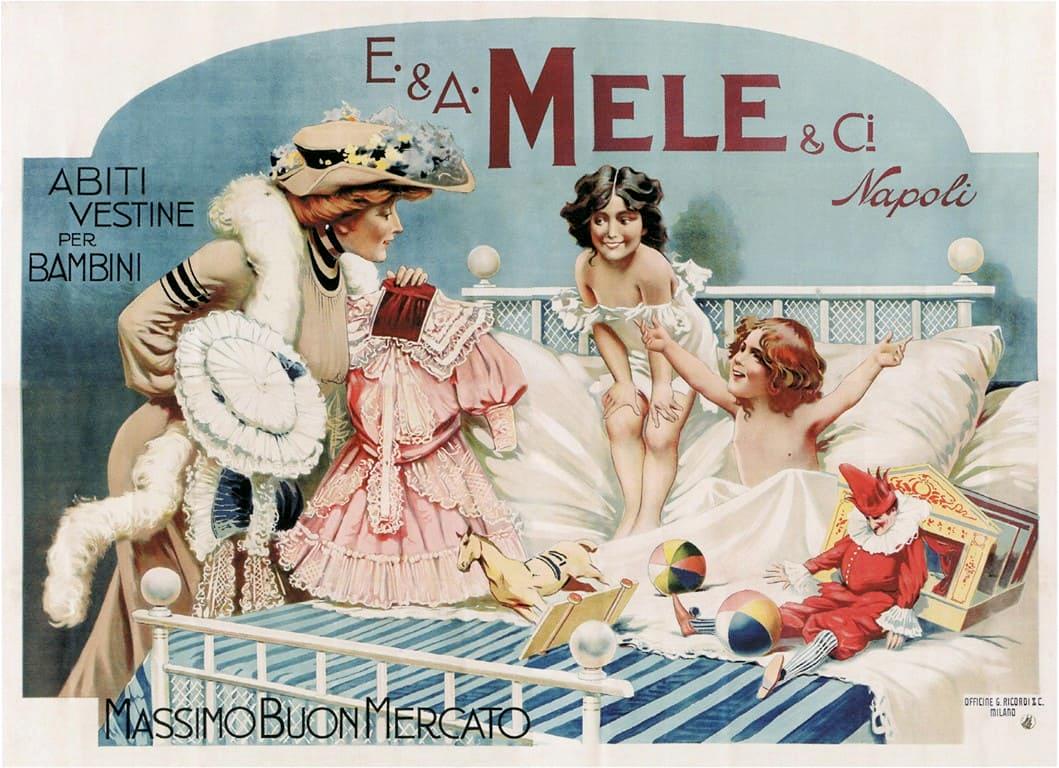 We have very little information about Italian advertising. Ann Italian reader sent us a full color advertisement for the Grandi Magazzini Mele, a department store in Naples. The store was founded by Emiddio and Alfonso Mele (1889). By this time department stores wer common throughout Europe and North America. The store offered goods for the upper middle class as well as lower income families as well. Here is an advertisement for children's clothing ('abiti e vestine per bambini') dating to the early 20th century. We would guess around 1910. We are not sure just where it appeared. A magazine or catalog would have dated it to the about 192O, but the dress looks more like about 1910. Our Italian reader reports that it was a poster which could have been bout 1910. We believe that posters like his were more common in Europe than America where mass produced catalogs were a major adverising method. The difference in part was partially due to the higher incomes of Anerican consumers. We note posters for events like the circus, but have not encountered American posters like this for the big deprtmenmt stores. The focus of the cpster here is on a fancy new pink dress. Thes suggestioin is that the girls did not go shopping with mother. The ad also reminds the buying public that toys and women's clothing were lson on offer. It is interesting the contrast between the abundance of garments and toys and the caption: 'massimo buon mercato' (very cheap). The store went bankrupt during the Great Depression (1932).