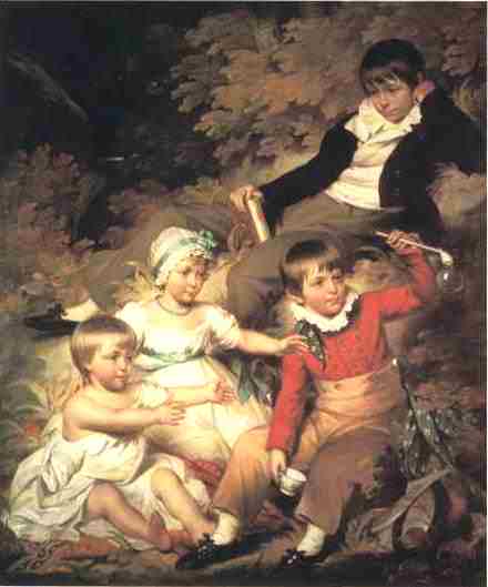 One painting depicts Henry, Jane, Sara, and Catherine, the children of Henry Hoyle Oddie, a London lawyer who commissioned the portrait in 1789 (igure 1). Henry wears a skeleton suit, but with kneepants as long pants were just beginning to become fashionable for boys in the late 18th century. Beautifully painted, The Oddie Children is also noteworthy for its composition. Beechey masterfully links the four children through their poses, yet accords each of them individual prominence by silhouetting the fair-haired children against dark backgrounds and the dark-haired daughter against the pale sky. Above all, one imagines that it was Beechey's ability to capture the innocence and charm of childhood that must have especially delighted his patron. Note Henry's suit. It is a single colored suit with heavy use of buttons. He wears a jacket and matching vest--with two columns of buttons. Note the buttons on the boys knee breeches--more than the three buttons that were the usual number. Also note the girls' white dresses--diferentiated by the color of ribbons, both blue and pink. Also notice how the boy dominates the group and his perhaps favorite toy, a bow and arrow is introduced. As in all great portariture, on gets a feeling for the children's personality.