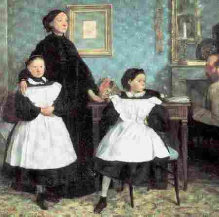 few paintings showing boys' fashions. A few paintings show French home life and typical dress. The painting of the Bellini sisters show the crisp white pinafore popular during the late 19th Century. A few