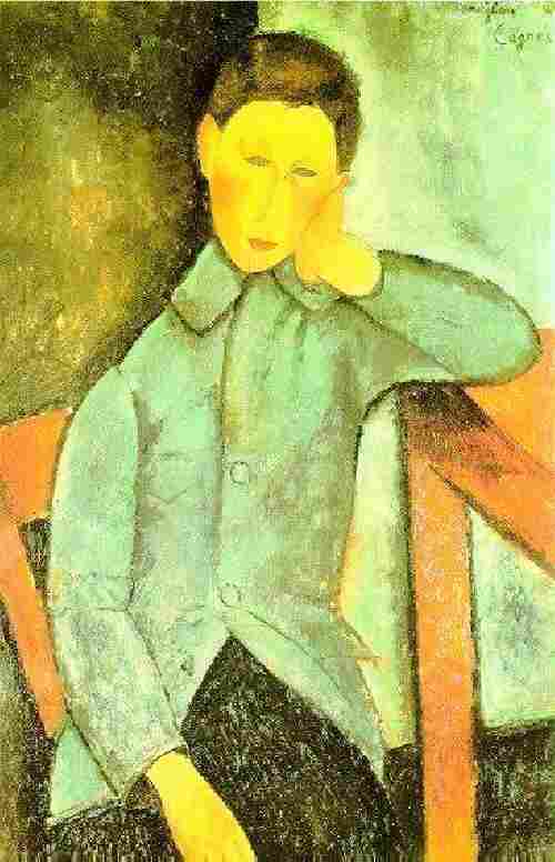 Modigliani, Amedeo (Italy, France, 1884-1920): Amedeo Modigliani is one of those artists tht even rank anateurs can instantly identify. He was born in Italy, but began to paint the portraits for which he is now famous in the 1900s after he moved to Paris. Modigliani has his own unique style, best expressed in wonderfully mannered portraits. His portraits were not an instant success and he endured gret poverty, which contributed to his poor health. He died of tuberculosis and drink when he was only 35 yeatrs old. He left a wonderful collection of portraits, including a few boys.