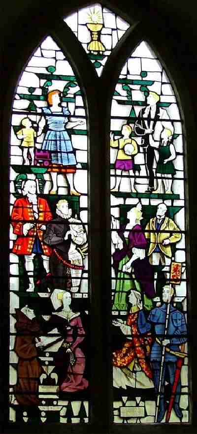 We have few examples of stained glass windows. A depiction of boys clothing is seen here in the modern stained glass windows of Holy Trinity Church, West