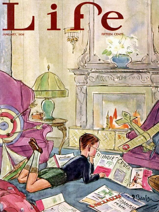 Figure 1.--Perry Barlow's illustrations are primarily associated with the 'New Yorker' maazine, but here is a cover he drew for 'Life' in 1936. The drawing is charming, but it is also interesting for fashion and social insights. Modern readers will not quite undertand it becaise the short pants di not suggest winter which is only obvious besides being cooped up inide by the date on the cover. Short pnts in 1936 had not yet made the transition as casual ummer wear. Younger boys at the time might wear shorts year round. And this was especially the case with boys from well-to-do familes. Of course America at the time was still mired in the Depression. Most families were just concernbed with getting by and Caribbean cruises were were the lat thing on their minds.