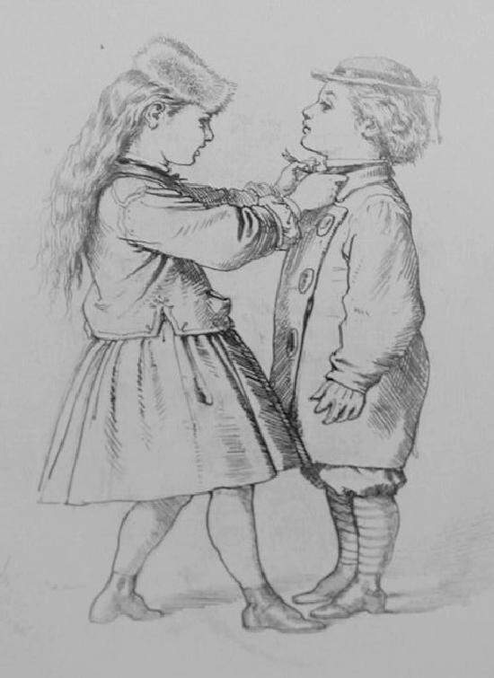 Figure 1.--I'm not sure when Hendschel drew this charming illustration of a big sister helping her little brother with his collar bow. We would guess it was drawn in the 1860s. Note the boy's stripped stockings. |
