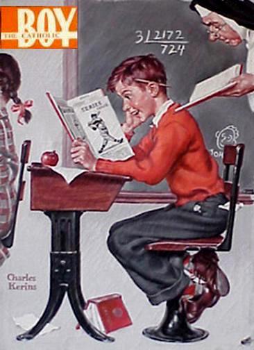 Kerins did wonderful covers for Catholic magazines, but by the time he worked, Catholics had entered the American and a Catholic president was eveb elected (1960). Thus his images depict the general American experience at the time. Because he did a great deal of work for Catholic magazines, he is not well known to the wider American public. This inclused Catholic Boy and Catholic Miss. Fr. Francis E. Benz formally organized the society for altar boys (1938). He also founded the Catholic Boy magazine. The Holy Cross Fathers of Notre Dame assumed the responsibility for the magazine (1948). Also involved were Fr. Frank Gartland, Fr. Thomas McNally, and Bro. James Lacrofka. Kerins was the primary Cover Artist for the magazine durung the 1950s and 60s. He created classical images of a contemporary boyhood. Some had a Catholic touch, but many did not.