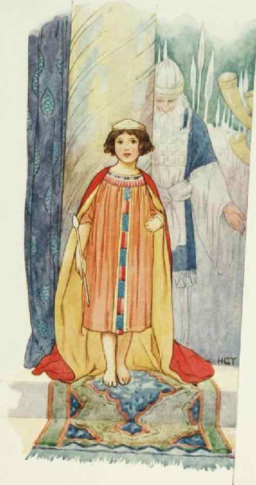 We have very limited information on Harry Theaker. We have noted some lovely Biblical illustrations that he did for Blanche Winder's Children's Stories from the Bible. I am not positive when it was published, but it appears to have been approximately 1930. A HBC reader writes, "The Theaker Biblical illustrations show dramatic and different styles of dress for the boys featured. In all of the illustrations, the boys dress is finely detailed, noting that the illustrator was well versed and knowledgeable of clothing during biblical times. It seems the illustrator details how boys living in the upper hierarchy would have dressed. Whilst I'm not sure if the boys would have always have been dressed like this on a daily basis, the illustrator no doubt took care to detail how ceremonial clothing would have looked like during those times." HBC is less sure how well reserched the illustrations are, but they are certainly beautifully done illustrations.