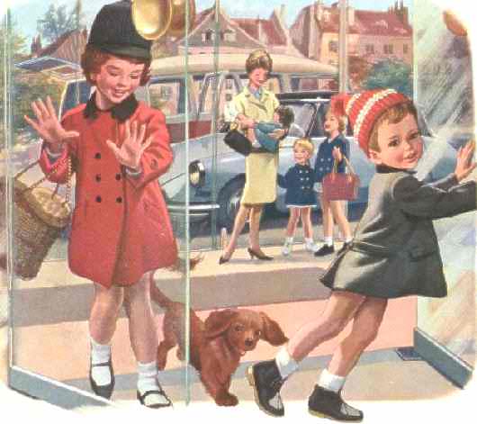 ![]() Figure 1.--This Marlier illuistration was done in 1964 and shows a French family going shoping during the winter. Notice the Citron, a classic French car, in the background. |