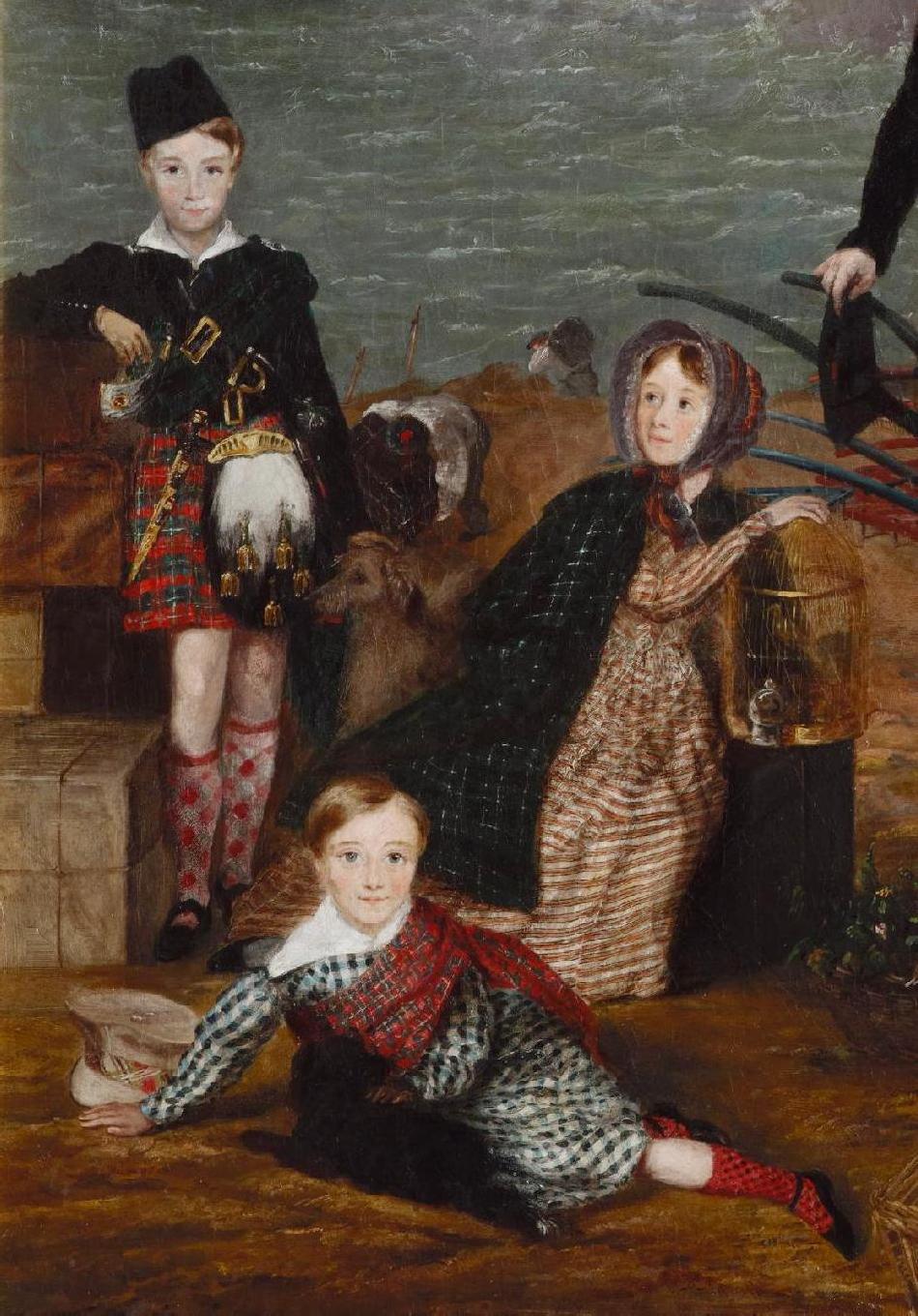 We have very little information about William Allsworth born (1811). His parents were Ralph and Mary. He exhibited 10 paintings at the Royal Academy -- London) (1836-56). All but one was a portrait. He was not a member of the Academy. His wife was Georgiana who surbived him. They lived at in Camden Town / St Pancras in 1861, which isn’t far from Bethnal Green. He also exhibited two portraits at the British Institute (1854 and 1856). His most notable work is 'The Emigrants’ (1844). This is the work that we fond interesting because it depicts a Scottish emigrant family with eight children. The individuals are painted in a rather stiff manner, giving the scene a rather a ‘naïve’ look. His portrairs seem more professionally done. But the clothing is pinted in detail. The only problem is that rather than a scene painted in Scotland, it appears to have been painted in London. The family was suposedly the wealthy Mackay family gathered on the coast near their Scottish Highland home - Drumdruin in Sutherlandshire. They are surrounded by luggage, and are preparing to New Zealand. The ship they have chartered to take them the Slains Castle cn be seen in the background. The father and husband is James Mackay Senior, the brother of the local laird. Here is the full portrait. Mackay stands at the back surrounded by his lrge family and mountin of luggage. His wife, Anne is seated near him with the baby. Their own six children: James Junior, Robert, Anne, Janet, Isabella, and Erica. Also in the group are two nephews - Alexander Tertius Mackay and James Tertius Mackay. Unfortunately we do not know who is who. We think Mackay boys are at the left and the two nephews are in the group at the right. The only problem is that they were not the Macays. Their actual name is unknown. We think they must have been Scottish as when they arrived in New Zealnd, unless they were Scottish, their accent would have given them away. The children apparently sat for the portait individually in a London studio. While the Highland scenery is imaginary, we believe the children's clothing is how they were dressed when they sat for Allsworth. Note that the boy's wear Scottish outfits or outfits with Scottish touuches. The girls wear English fashions which may have been similar to what a girls in a wealthy Scottish family would have worn. They apparently brought the portrait wih them to Zealand to help establish their elaborate family story. Chosing a recognized portratist helped him establish his bonafides which were in fact false. But he was wll to do and the family did well in New Zealand.