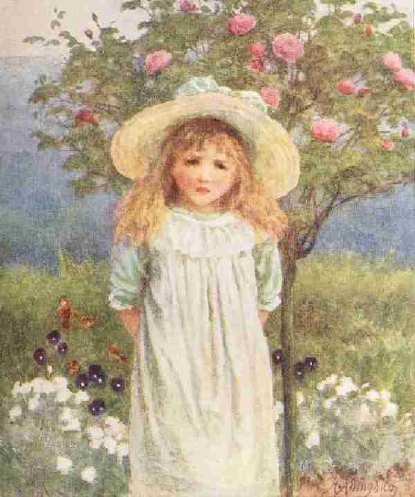 Mrs Allingham appears to have commonly used white pinafores for the children while at home, both indoors and outside for play. All of the pinafores appear to be white. We do not see anycolored pinafores. The pinafores seem to be very plain utilitarian one. we do not see any fancy pinafores with ruffles and lace. We notice that they were various lengths. Some seem very short. Others are quite long. Henry seems to have often worn pinafores over his dresses. His sisters also wore pinafores, even as teenagers. The pinafores can be distinguished from the smocks in that they do not have sleeves like the pinafores. Unfortunatly while we have quite a few imges of Allingham portraits, but we are not always posutive who the children are in the painting. As far as we can tell, however, the pinafores worn by Henry and Eva were essentially the same. We do not notice any difference in the pinafores worn by the two children.
